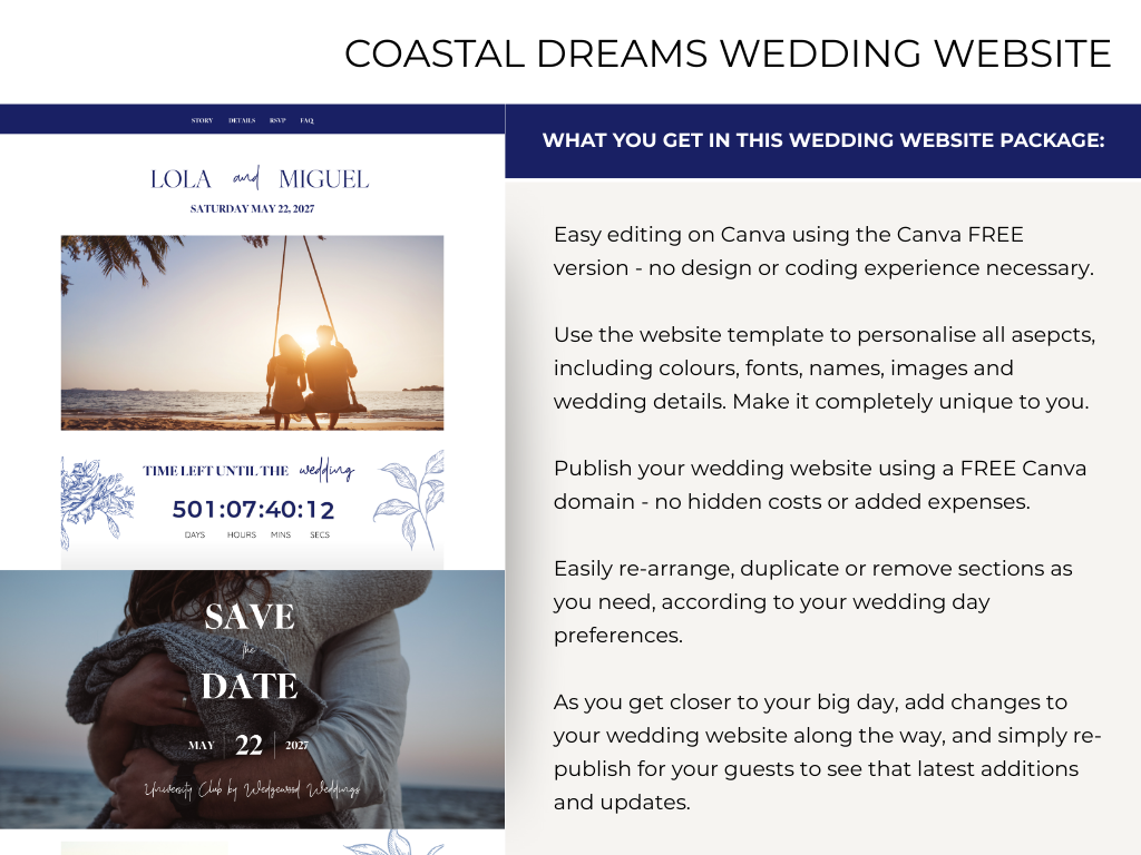 ✨ Make a lasting impression from the very first click. Elevate your wedding experience with the Coastal Dreams Canva Wedding Website Template.