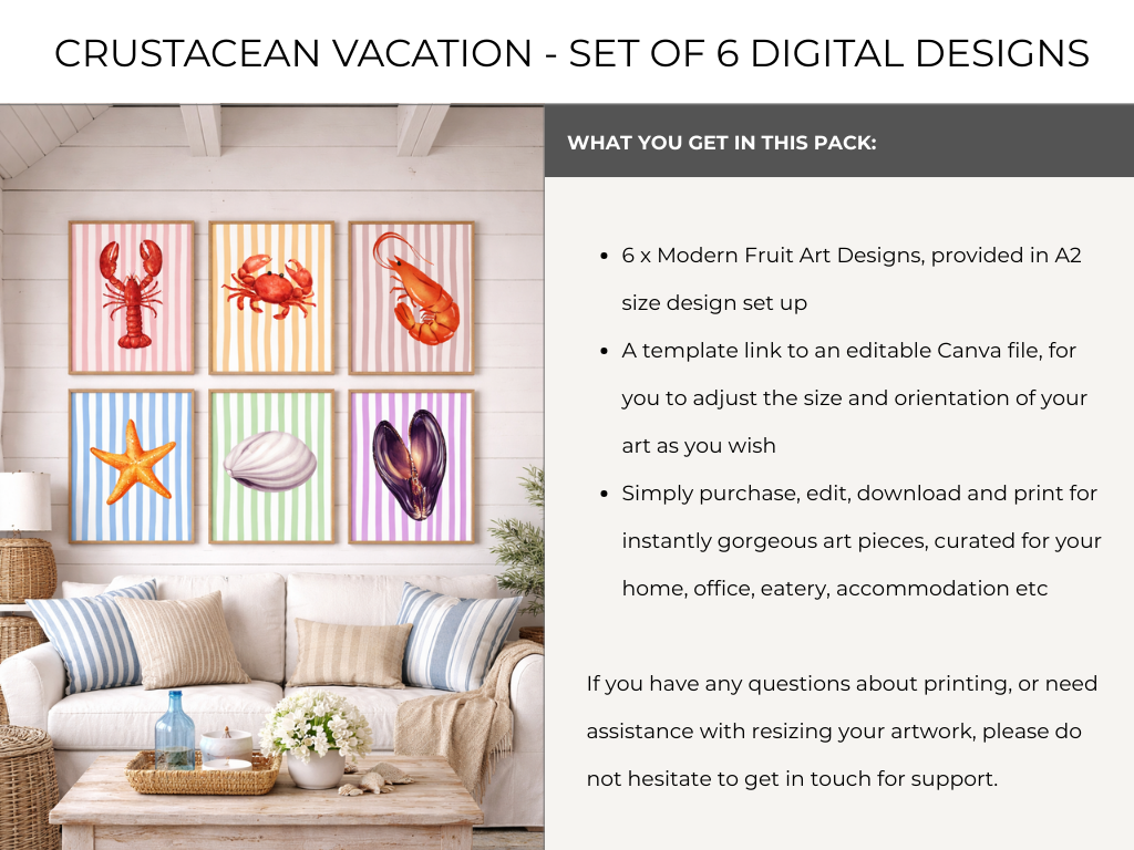 ✨ Crustacean Vacation is a bold, playful collection of 6 modern coastal-inspired digital artworks designed to bring effortless seaside charm to your space. Featuring contemporary crustacean illustrations with fresh colour palettes and graphic stripe backdrops, this curated set delivers a polished yet personality-filled look that feels relaxed, stylish, and distinctly coastal.